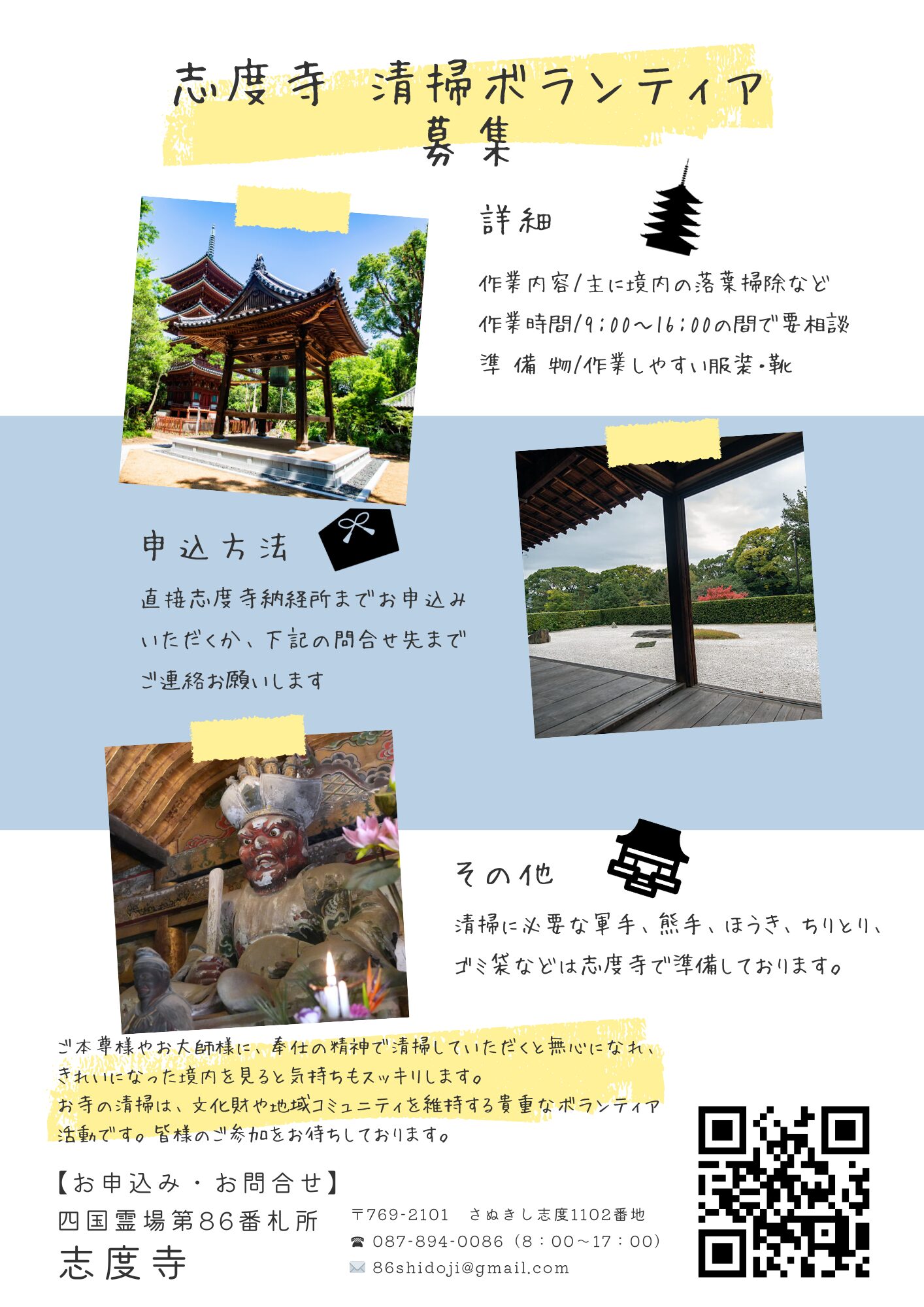 志度寺について お参り方法 由緒 境内 文化財 縁起絵図 庭園 お知らせ 2026年1月27日 志度寺 お能教室 詳細 2025年12月18日 志度寺の初詣 出店キッチンカー 詳細 2025年12月18日 志度寺の大晦日 除夜の鐘 詳細 行事案内 体験行事 月例行事 年中行事 納骨・葬儀 ご祈願・ご供養 授与品 ギャラリー 手水舎 Read More 納骨堂 Read More 弁財天堂 境内の北西端にある。 Read More 三社(祠) Read More 大楠 本堂裏の大楠 Read More 境内 様々な草木花が生い茂る境内 Read More もっとみる アクセス 前後のお寺へのアクセス、主要交通網アクセス お遍路について ご寄進について